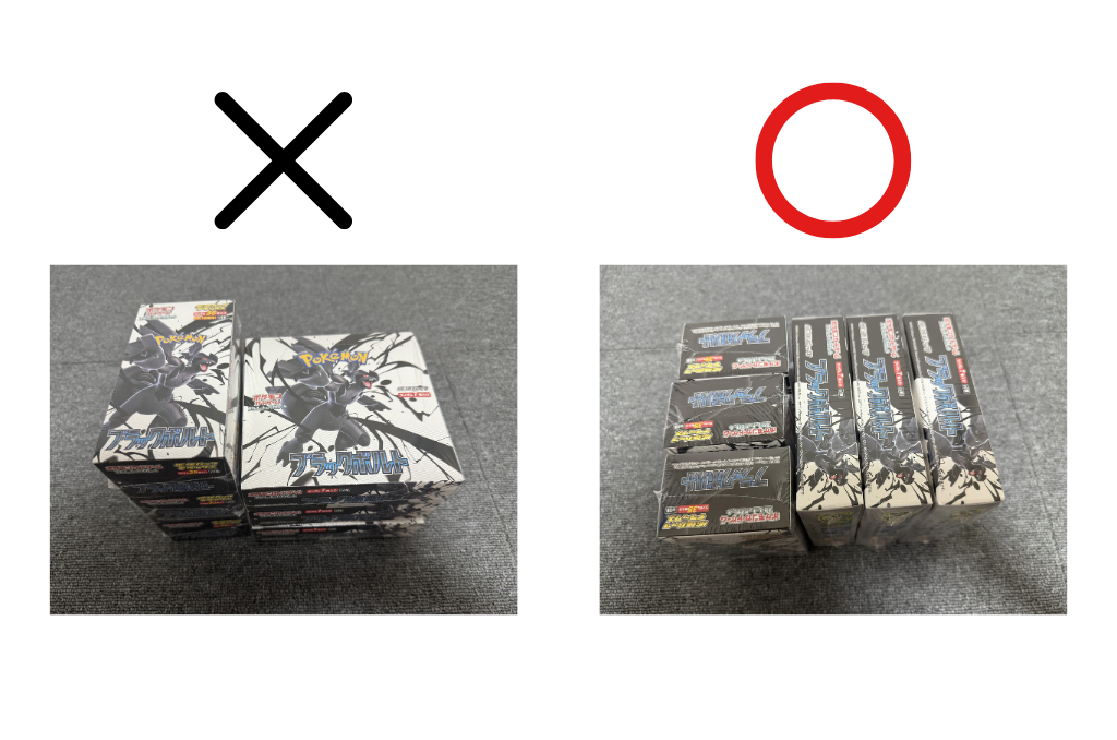 商品がダンボールに接しないよう、梱包材で一まとめにしてください。(1BOXごとの梱包はしなくて大丈夫です。)